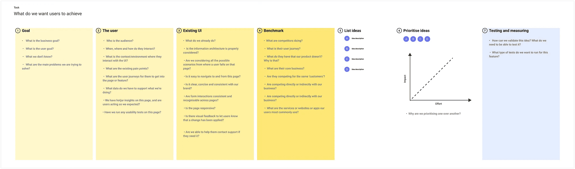 As we do this work of clarifying the insights we have, and before starting ‘pushing pixels’, we can create a complete board where we can come back any time and reframe the problem and the solutions. As we gather more and more insights about what the user needs to do, what is the business goal is, and how others handle the same problem, we can make sure that we are approaching the problem in the right way. Usually, this template is filled with answers, but for this purpose, I’ve filled it with useful questions we usually ask to find the right answers.