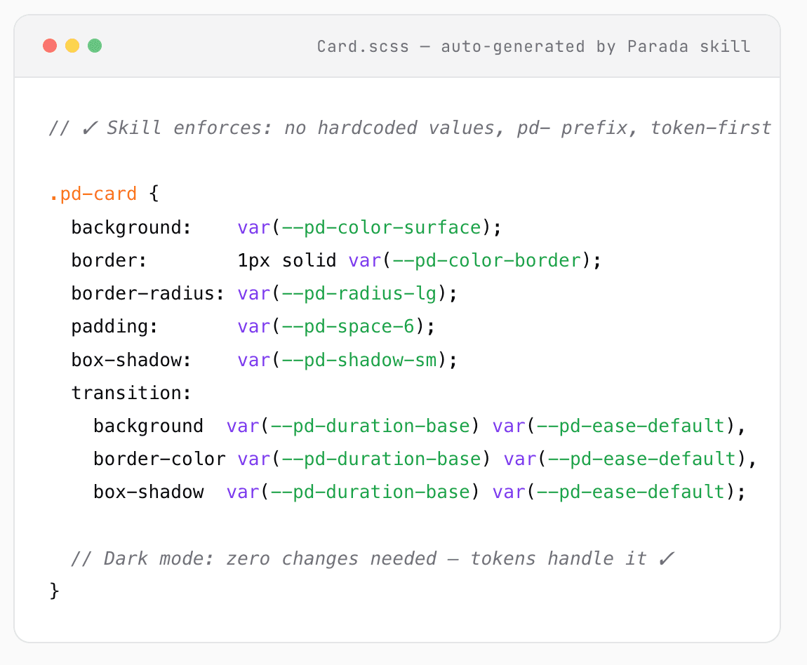 After the skill: Claude checks the actual Parada DS checklist. It flags every hardcoded hex value, every missing pd- prefix, every z-index that should be a token, every input missing a label association. It tells me exactly which line violates which rule and what the correct token is.