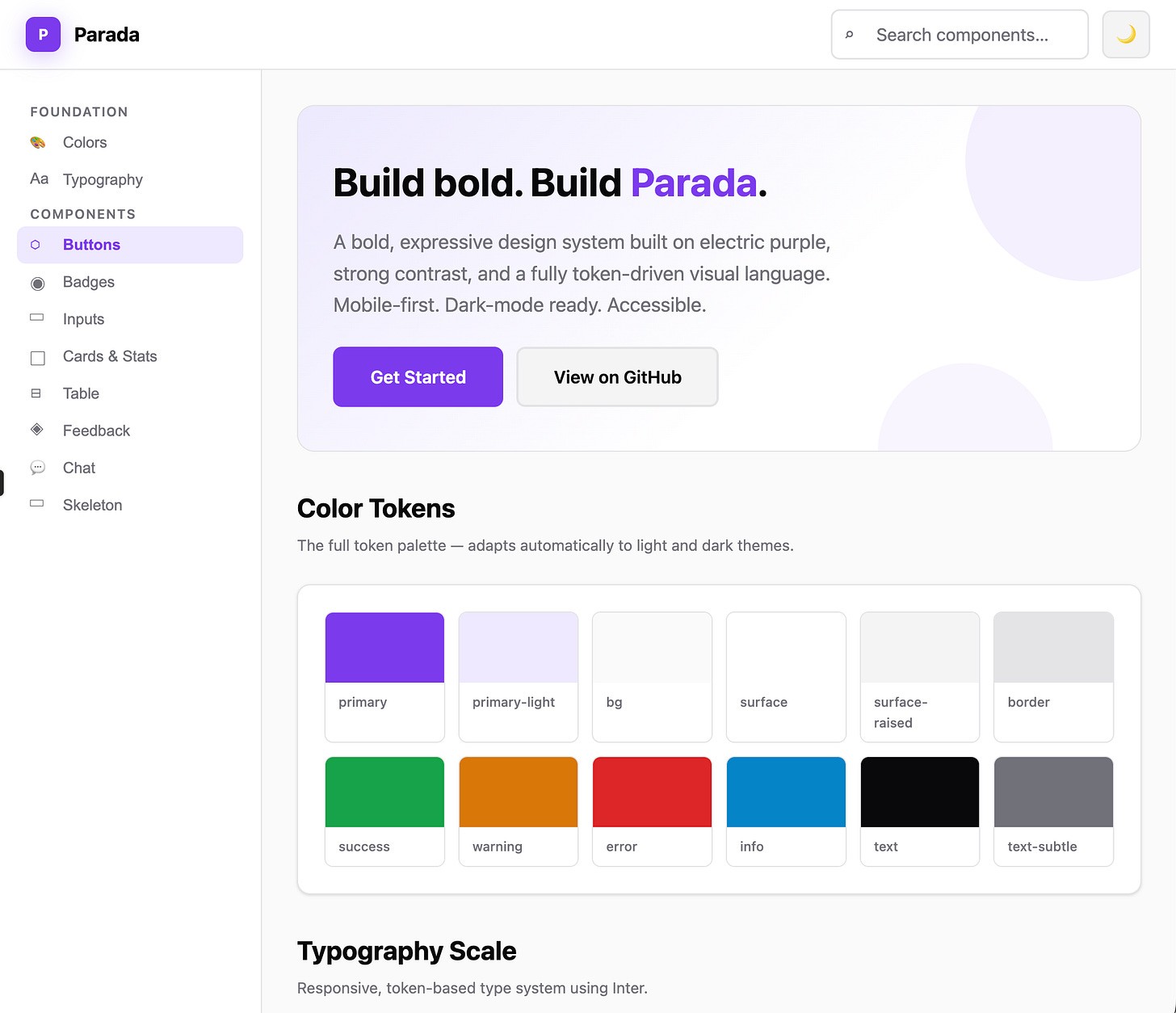 Design system preview website, built reusing Parada DS skill. Every component follows the BEM prefix convention, mobile-first layout, and WCAG 2.1 AA accessibility requirements with proper ARIA roles throughout.