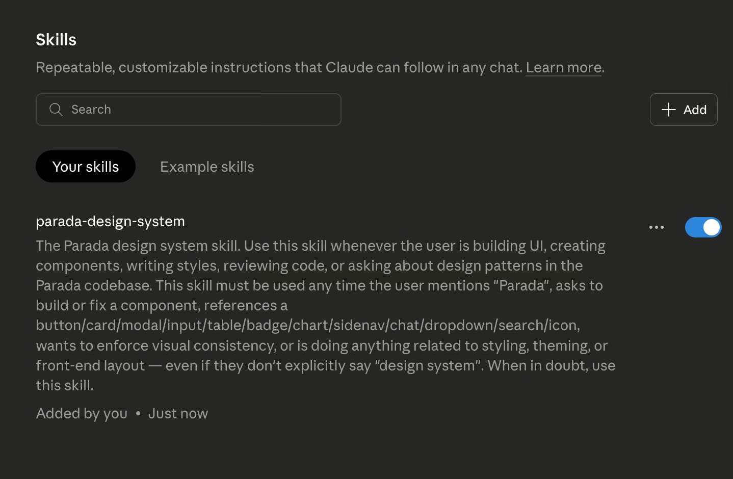 I haven’t tested this directly yet. But if a developer asks Claude Code to implement a component using the skill, those questions may already be answered by the skill context. Although, distribution turned out to be the easier half of the question. The part I’m still thinking through is what happens when the design system evolves, which it does, constantly.